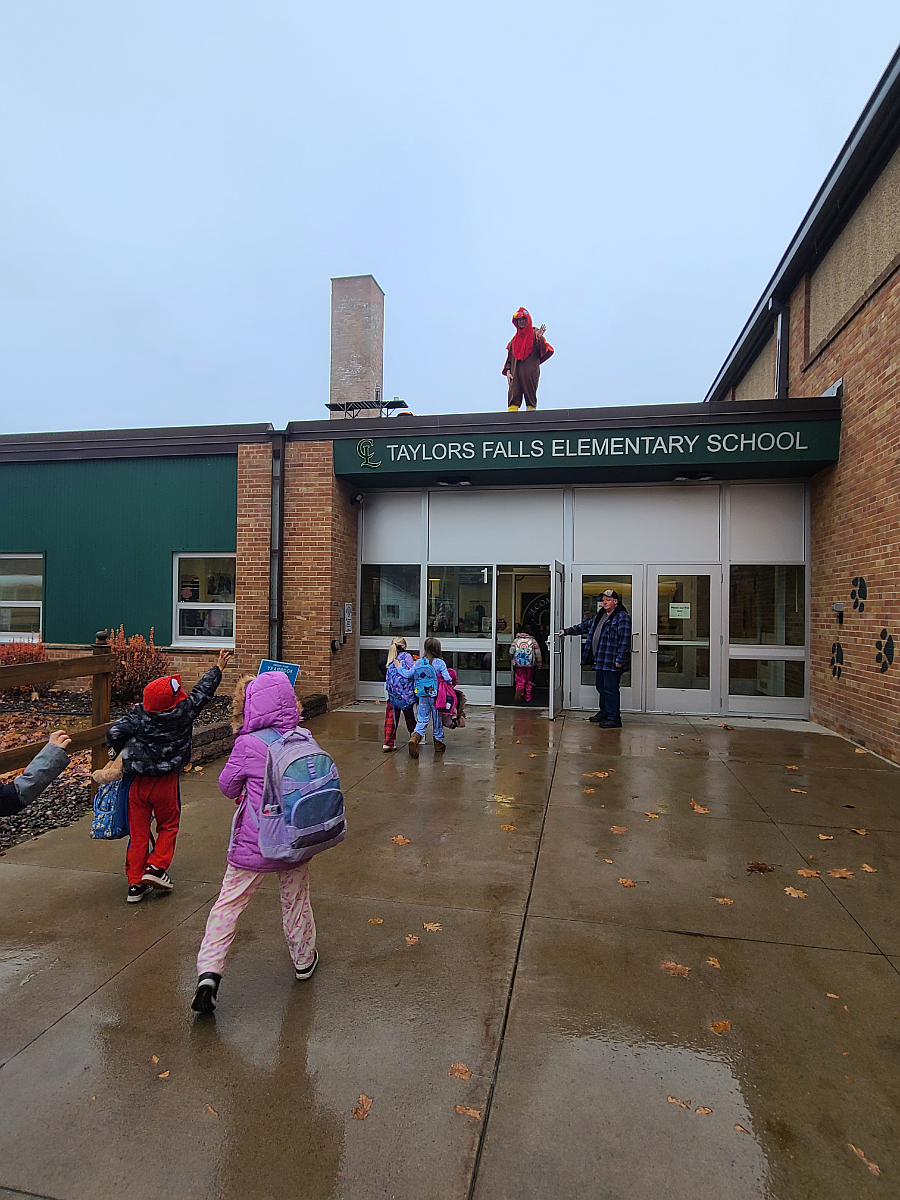 Students at Taylors Falls Elementary School met their fundraising goal of 12,000 dollars. Principal Jason Riebe slept on the roof of the school the night of November 24 (it rained that night). As the other part of the deal was Riebe had to wear a turkey costume.