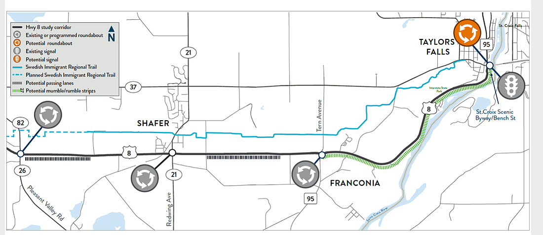 Jefferson said the section that involves the city of Shafer will tackle safety issues including high speed vehicle traffic, unsafe passing behaviors, the number of driveways and access points that cause safety issues, pedestrian traffic including bikes and crashes at the intersection of Redwing Avenue and Highway 8. It was noted the county has approved and is moving forward with the construction of a roundabout at the Redwing intersection. The plan for the Shafer section is to potentially create passing lanes, turn lanes and install rumble/mumble strips in the roadway to assist drivers.