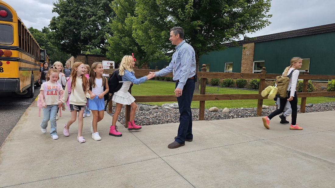 Excitement was high for the first day of school Tuesday at Taylors Falls Elementary School. Students were met by Principal Jason Riebe. Riebe has made this a first day ritual to greet all of his students on the first day.