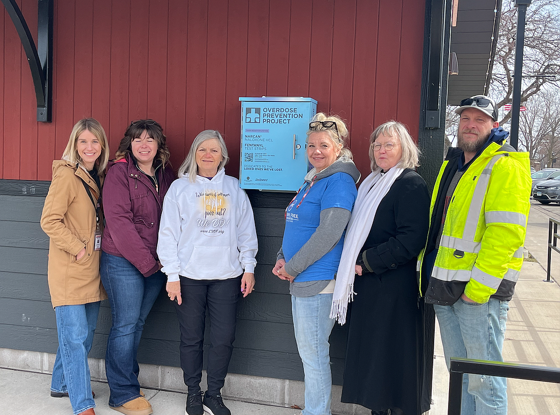 The public restroom building at Moberg Park on Highway 8 in Chisago City is where this fentanyl response kit has been installed on the west side of the structure. It contains Naloxone (nasal spray form) and fentanyl test strips. These are regularly stocked inside the storage box available free, for use in the fight against overdose deaths from fentanyl. Please take what you will use but please don’t hoard. The organization Fentanyl Free Communities is offering all-hours access to combat overdose. Established Naloxone Access Points where products like Narcan are publicly accessible, are generally inside of buildings not open 24/7. This Fentanyl Free Communities station is provided using opioid lawsuit settlement monies administered through the Chisago County Opioid Action Council. There are 10 total stations now in Minnesota, and this Chisago City box is the first in Chisago County. Pictured are Michele Hein, FFC; Pastor Sarah Kerkes, council member; two staffers with Chisago City Parks, and city park Supt. Doris Zacho who is also on the council and a representative for county public health.