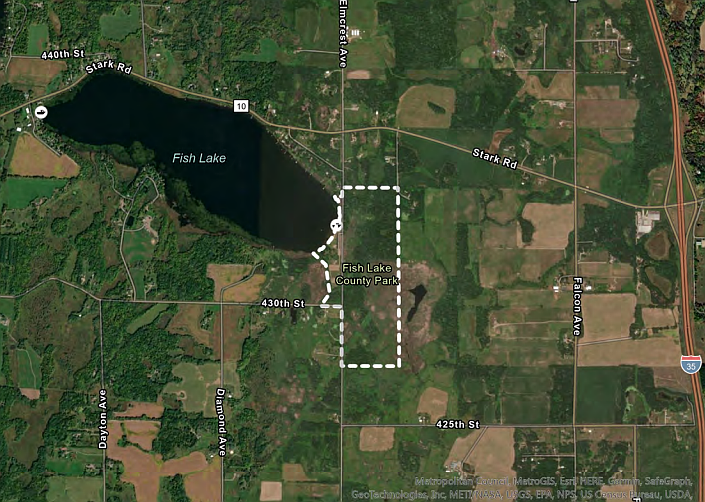 Preparing for population influx to this area, and growth in park use is a priority of the (long range) Master plan and Fish Lake Park has Elmcrest Avenue, #65, that runs through the rectangular-shaped parkland— and park visitors safely negotiating this roadway is among the issues the county has identified.