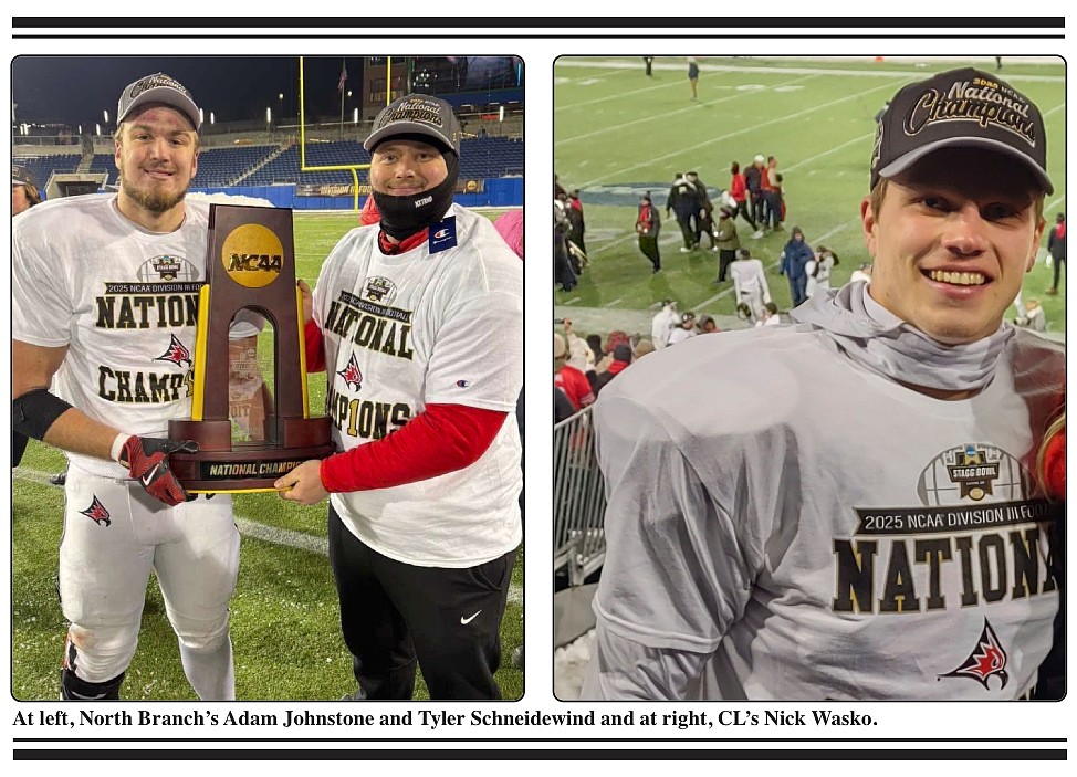 When the University of Wisconsin–River Falls football team broke through and claimed the NCAA Division III national championship, the moment reached far beyond the Falcons’ sideline at the Hall of Fame Stadium in Canton, Ohio on Sunday, January 4. It carried back across Lake Erie and Lake Michigan and the St. Croix River and into Chisago County, where familiar names — Nick Wasko of Lindstrom and Adam Johnstone and Tyler Schneidewind of North Branch — stood as hometown representatives on college football’s biggest Division III stage.