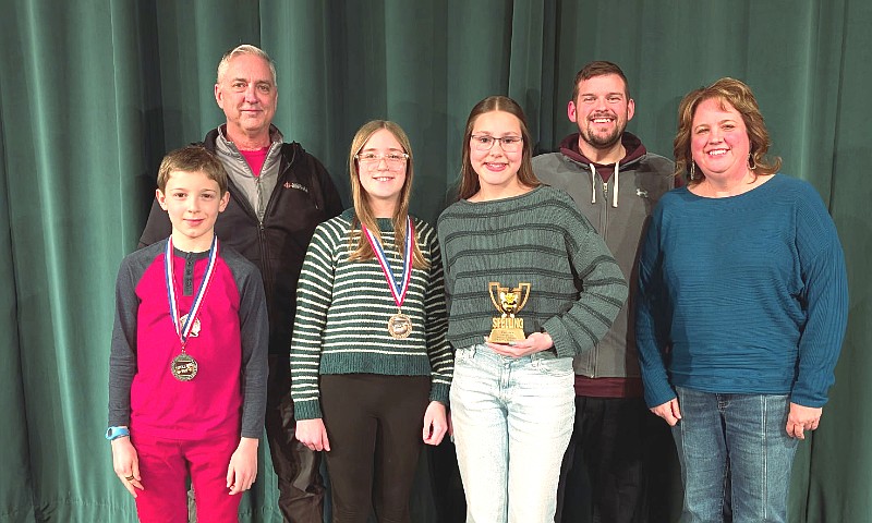 The Chisago Lakes School District held their annual Spelling Bee competition for fifth and sixth graders during the frigid temps on Thursday, January 22. Carly Serwa (middle with the trophy) got first place with the winning word being ‘almanac’. In second place was Michael Christopherson (far left) and third place went to Anika Matko (middle, with medal) who won in a spell off against Derick Oknich. There were eight competitors in the bee that was judged by Chisago County Press Publisher Matt Silver (back left), Sports Editor Jeff Norton (back middle) and school board member Jen Penzenstadler (right).